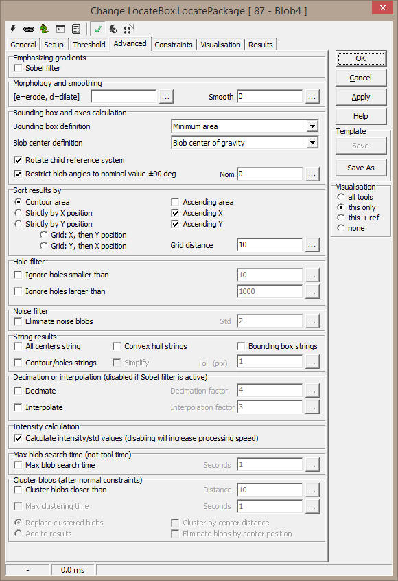 • Cluster by center distance - Normally, the distance between blobs is measured as the smallest distance between the blob contour polygons, which can be a time-consuming operation. If this option is checked, distance between blobs is defined as the center distance. Useful if the blob sizes are similar. You should also increase the Distance setting some.