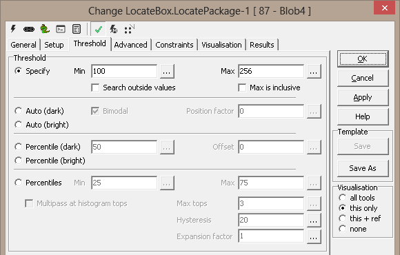 • Note: Minimum and maximum threshold can be linked to a result in another tool - very often a percentile value from the Intensity tool