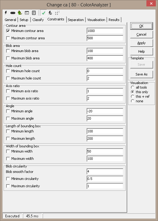 The blobs resulting from the analysis can be filtered out by a set of criteria: