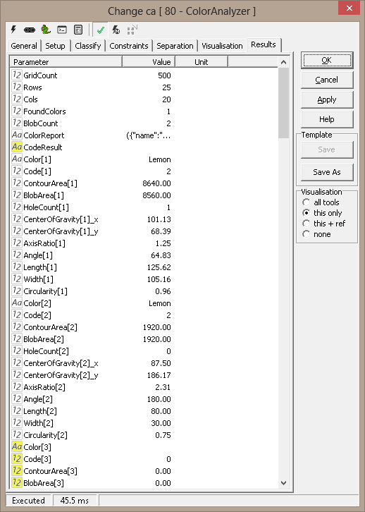 Note: The visualisation colors for the BoundingBox, ColorName or Match are not used. Instead, individual colors can be defined under the Setup tab.