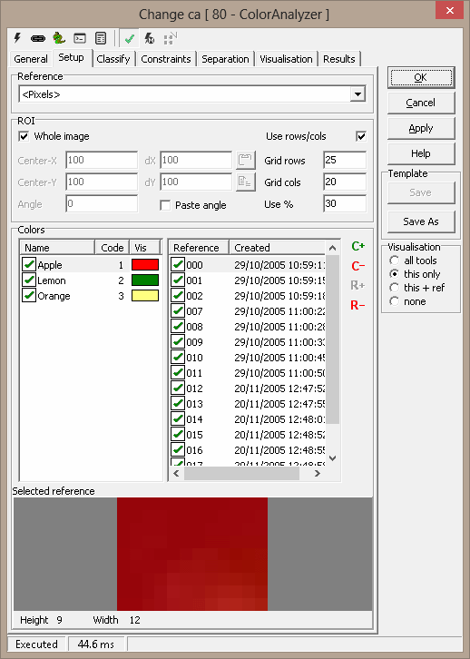 These results can be used to spot outliers in a color group. If the mid separation in dB falls below the Mid color separation warning threshold, and the min separation below the Closest separation warning threshold, the checkmark in front of the color name turns red. You can spot the outlier reference under the Setup page as well, where both the color and the reference will be marked in red.