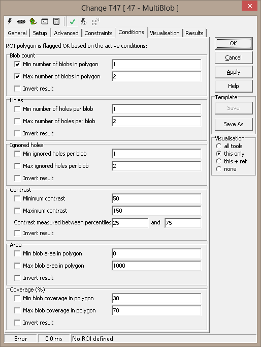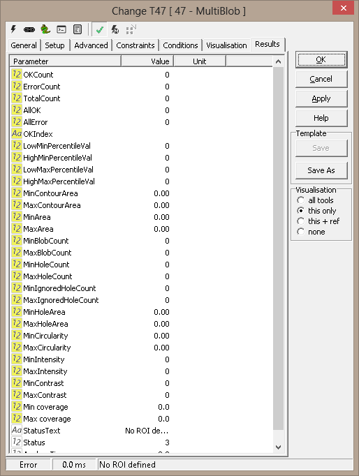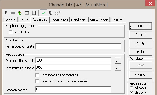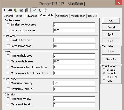 A set of constraints can be specified, limiting the blobs that are found by the tool (result validation). The constraints apply to each blob, and all must be satisfied for a blob to be considered qualified.