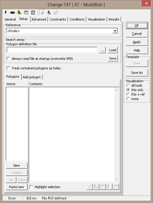 The MultiBlob inherits its main properties from the Blob2 tool. In addition it has a Condition feature that allows the user to classify the state of each polygon as true or false. This is very useful if you need to check the presence of N equal objects in an image. See image below where the separation between two lines is checked with one MultiBlob with two polygons.