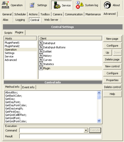 Command edit field. By clicking Execute the command is sent to the named control, and the result is shown in the