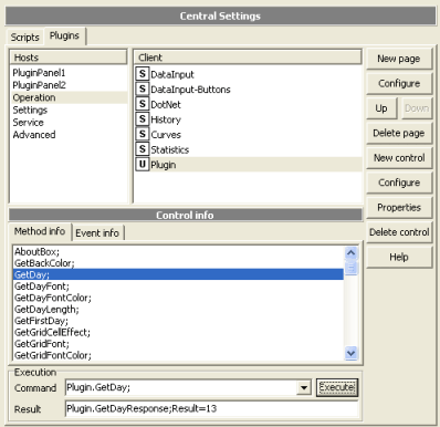 Any methods the control exposes are listed in the Method info list, with parameter names and types. The controls are identified by the name of the inserted page, with a period (‘.’) separating the control name from the command name, for example, “