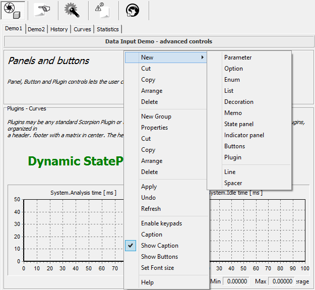 An input page consists of named groups or sections. In each group a list of editable parameters is contained. A group or an item can be copied between pages and profiles.