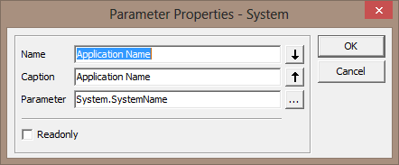 The Application Name system properties show a Name, a Caption and Parameter. It is possible to configure multiple languages in a Data Input Page - the Caption be language specific. By linking the System.SystemName means that the user has Read/Write access to this value when editing the Application Name in the Data Input Page. It is possible to mark a value read only.